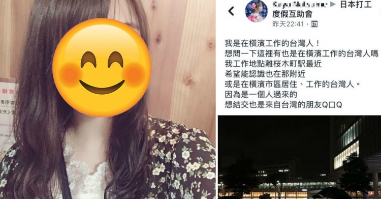 這幾年真的不少台妹勇闖國外 就有一名妹子在臉書社團發文,表示自己一個人來的,有沒有同是在日本橫濱工作