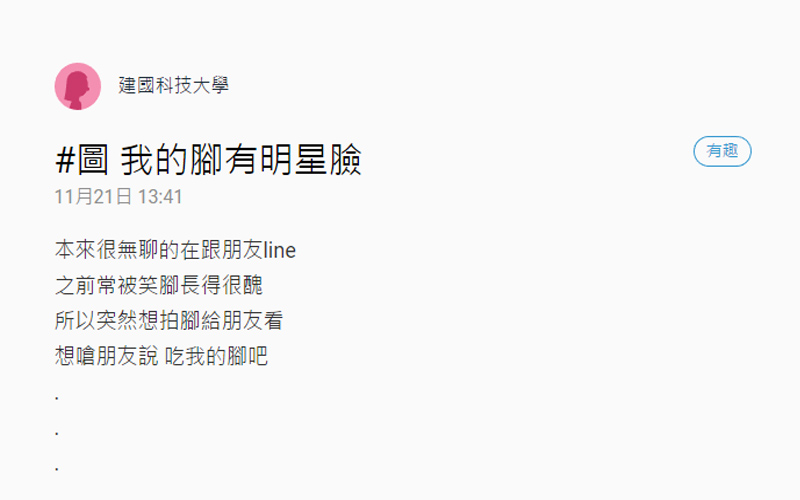 本來很無聊的在跟朋友line 之前常被笑腳長得很醜 所以突然想拍腳給朋友看 想嗆朋友說 吃我的腳吧