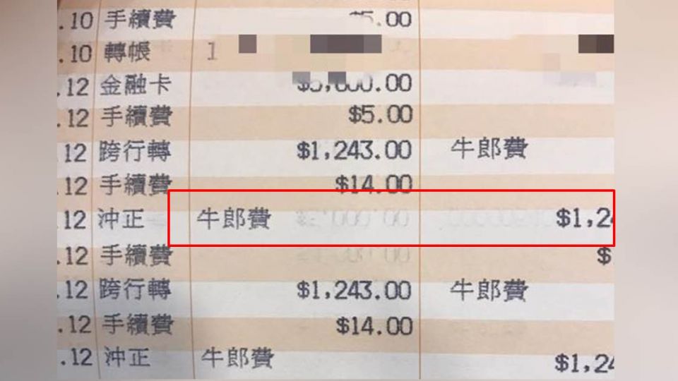 最近,一名網友去銀行補刷存摺,上面除了正常的交易明細外,竟然出現了2筆「牛郎費」,每一筆都是1243