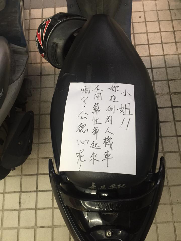 人真的要有公德心,睜眼說瞎話的人真的越來越多了!有位網友上臉書爆料公社氣呼呼發文,說他的機車被一個女