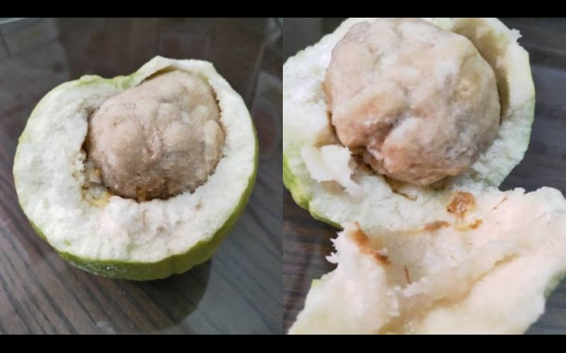 近日有網友準備切芭樂,剖開卻發現一顆「大貢丸」馬上到網路上發文詢問網友: 「買芭樂送你貢丸,外面是脆