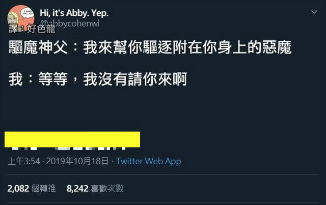 – 驅魔神父說 要幫我驅逐付在我身上的惡魔 但我怎麼想都不對 我沒請啊 結果原來是