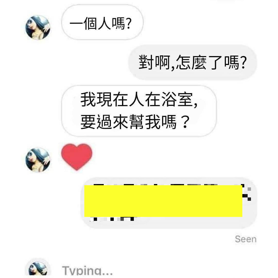 – 我喜歡的女生傳訊息給我 他說他現在人在浴室,問我要不要過去 還傳了愛心!!!! 哇