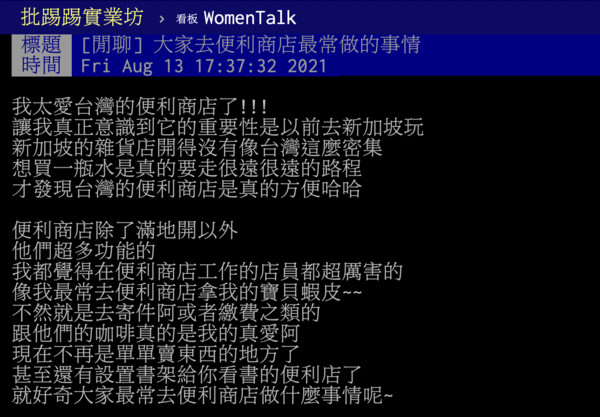 台灣四處可見超商,裏面販售的商品應有盡有,提供的服務更是多元。對此,即有網友在PTT上分享自己超愛台