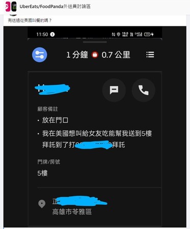 ▲外送員接到一筆來自美國男友的愛心訂單。 不少遠距離的情侶,會透過互相幫對方叫外送的舉動,來增加彼此