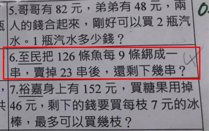 國小三年級的數學解不開! 一名爸爸發文求助網友,兒子數學作業的第六題寫道「126條魚每9條綁成一串,