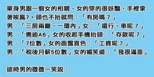 1 單身男跟一個女的相親,女的穿的很妖豔,手裡拿著唉鳳7。 頭也不抬就問:「有房嗎?」 男:「三房兩
