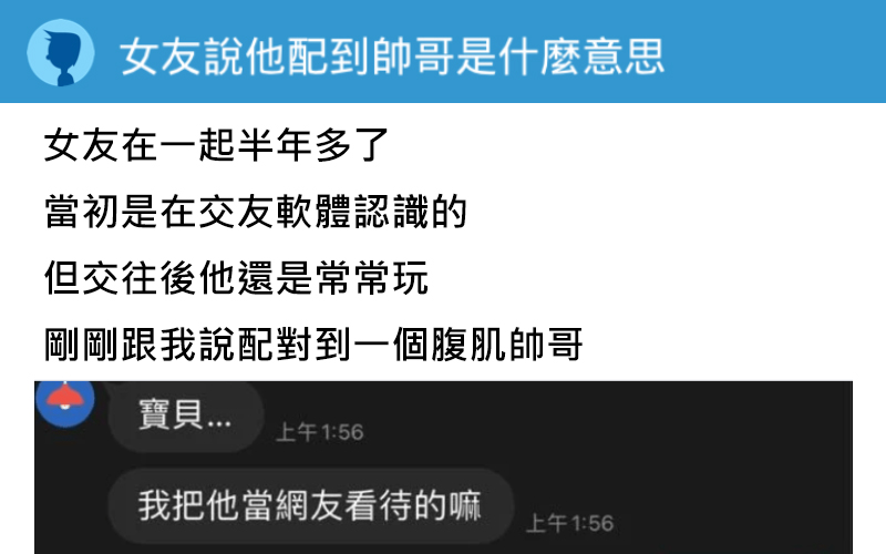 網友困惑發文求助! –以下原文: 女友在一起半年多了 當初是在交友軟體認識的 但交往後他
