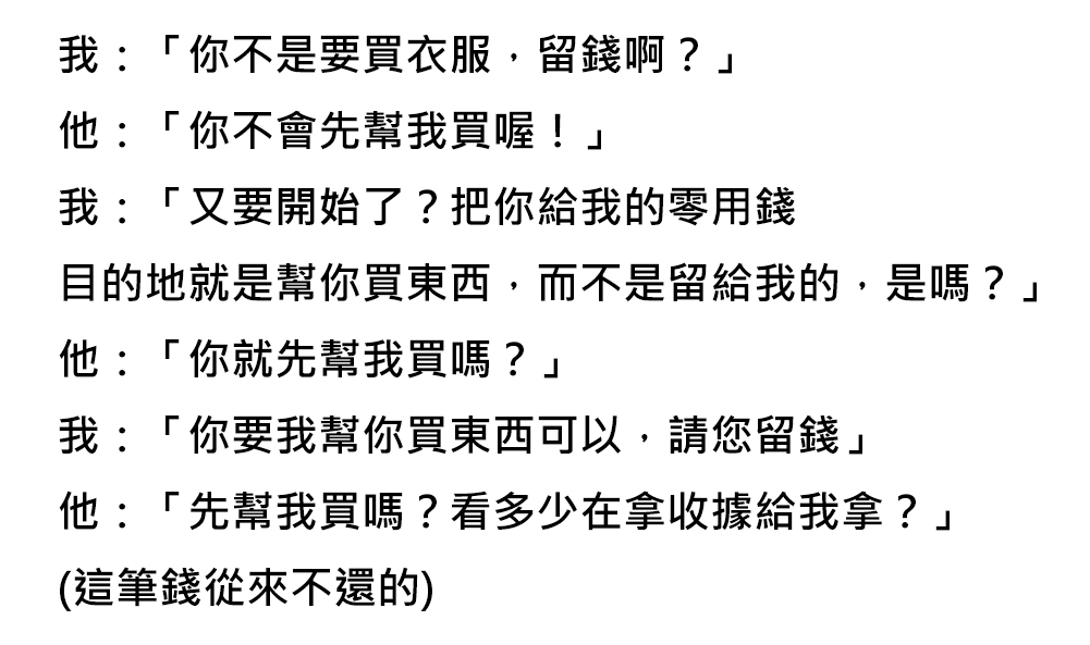 網友在臉書社團上發文: 一大清早… 我:「你不是要買衣服,留錢啊?」 他:「你不會先幫我