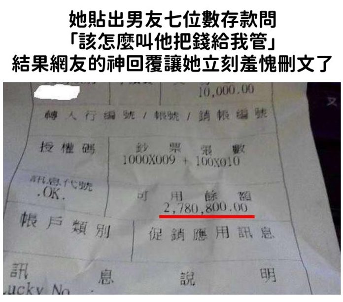當你在無意間看到伴侶的存款數目時,會有什麼樣的反應呢?一位女網友從交往3個月的男朋友口袋中,翻出了1