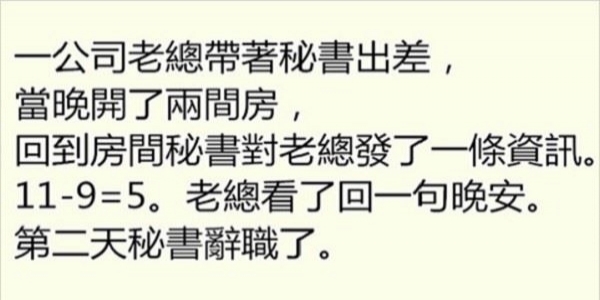 一個公司總裁帶著秘書出差, 當晚開了兩間房,回到房間秘書對總裁發了一條簡訊。 11-9=5。 總裁看