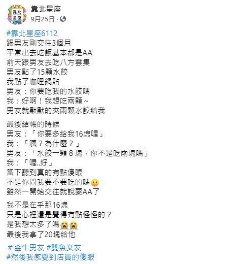 許多情侶約會選擇「AA」制平均分擔費用, 不過有時一方太過計較容易發生爭吵。一名女網友透露, 日前和