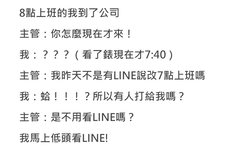 8點上班的我到了公司 主管:你怎麼現在才來! 我:???(看了錶現在才7