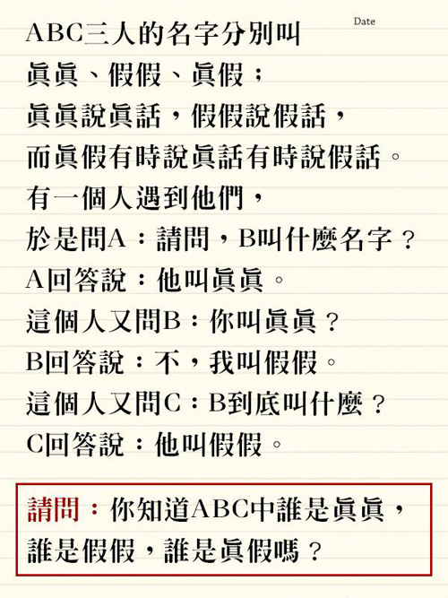 A是真假,B是假假,C是真真 A是真假,B是真真,C是假假 A是真真,B是假假,C是真假 正解往下看