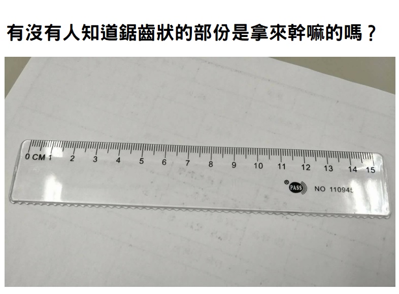 近日有網友在社團中PO出一張有鋸齒邊的尺,問「有沒有人知道鋸齒狀的部份是拿來幹嘛的嗎?」,立刻引發網