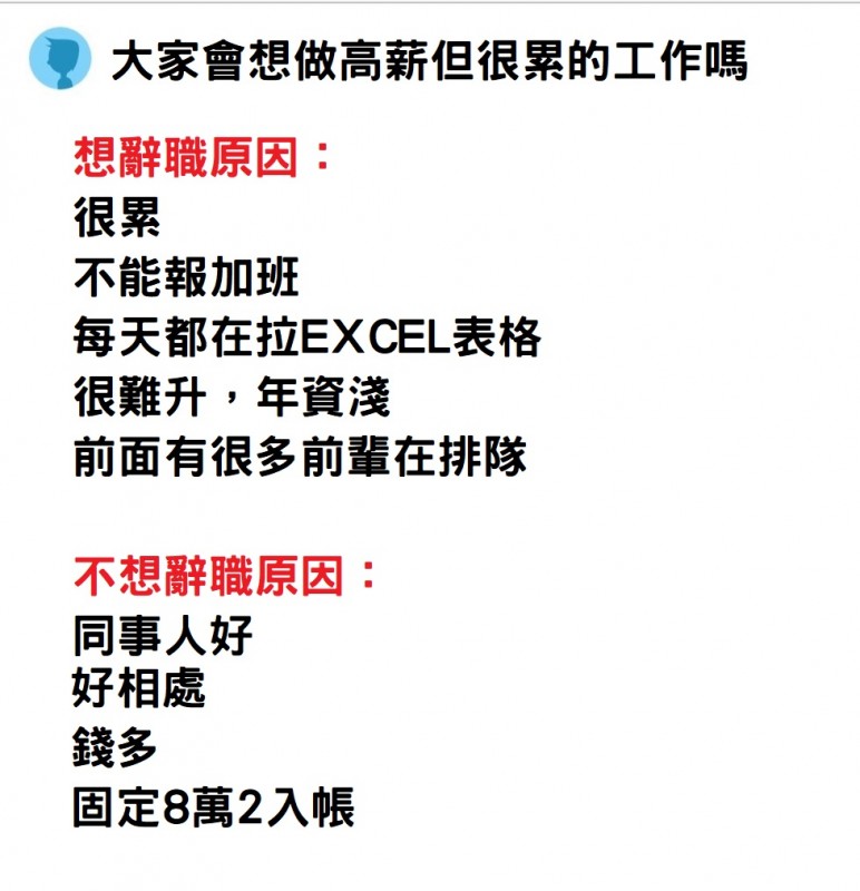 一名網友表示,自己月薪8萬2,但工作沒什麼能學,加上常常加班,讓他萌生辭意。文章一出,立刻引發網友熱