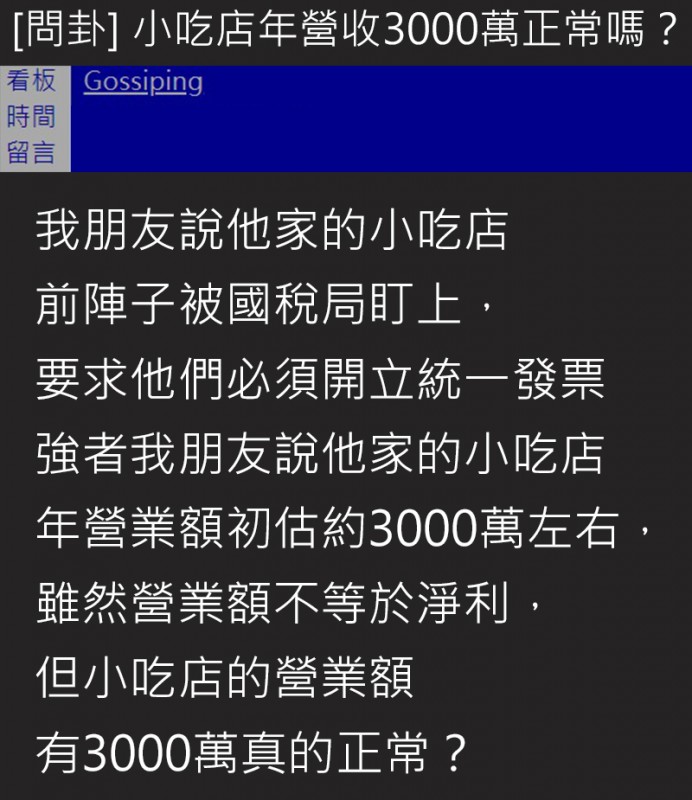 最近有網友發文表示朋友家的小吃店被國稅局盯上了 並要求他們要開立統一發票 一經過詢問才知道,原來他朋