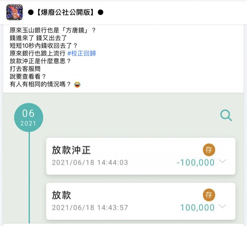 「原來銀行也是『方唐鏡』?錢進來了,錢又出去了」一名網友在網路上表示,近日查看帳戶時,發現有一筆10