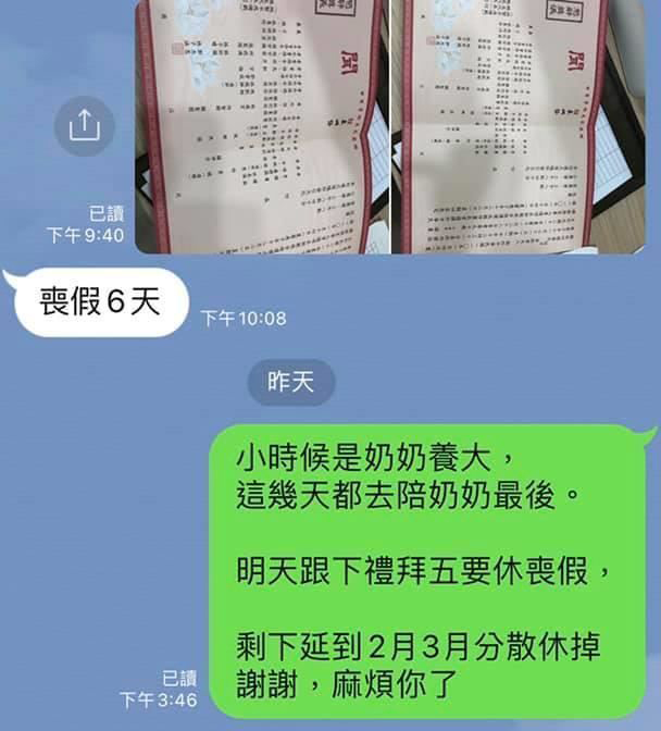 人的一生中總會碰到一些生離死別,一名網友分享奶奶過 世後,因為做忌跟告 別 式要請假,