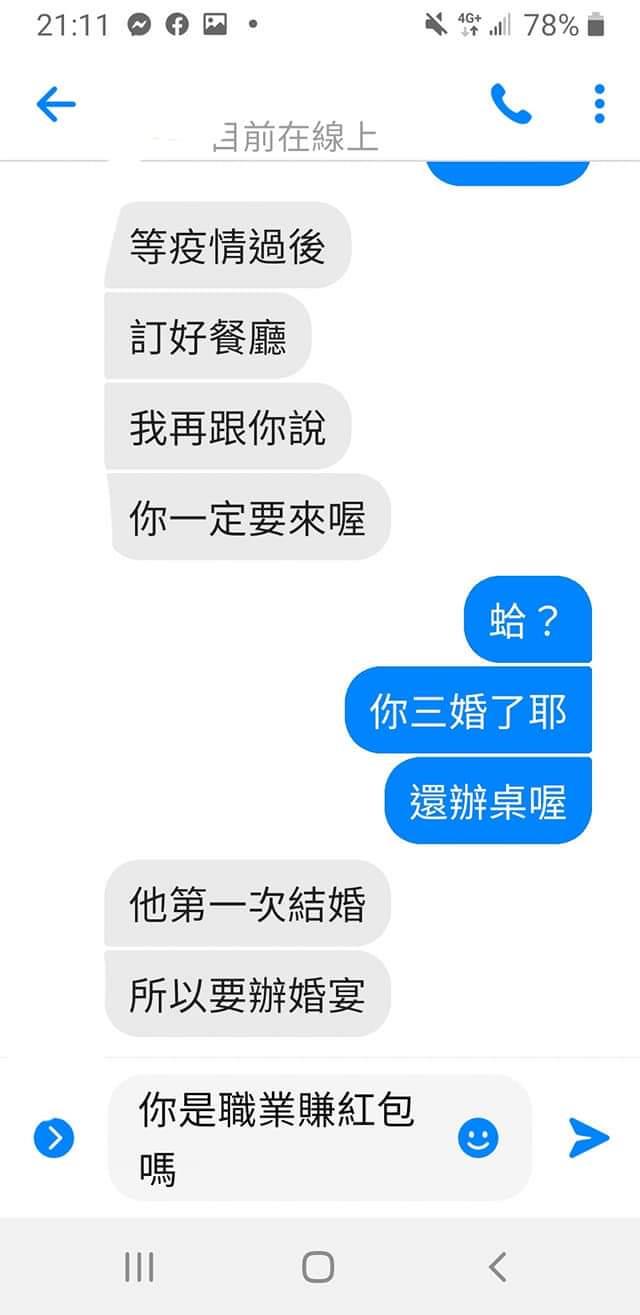 一名網友在臉書社團上發文: 【妳十年之內結了三次婚,每次都發喜帖,妳真的很敢,臉皮是什麼做的啊,真的