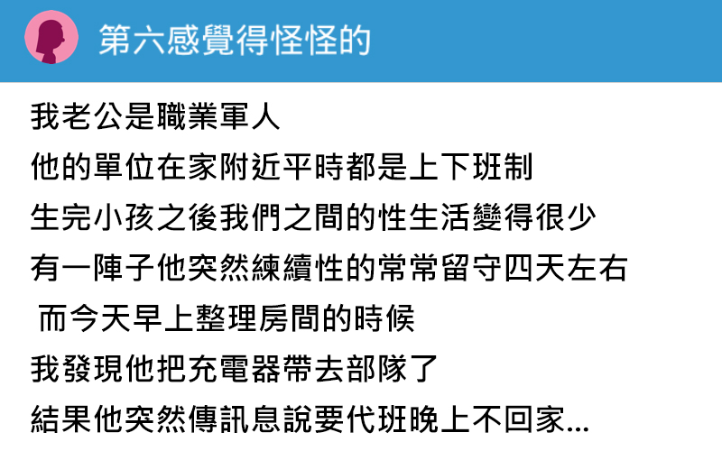 我老公是職業軍人 他的單位在家附近,所以平時都是上下班制。 生完小孩之後我們之間變得很少 有一陣子他