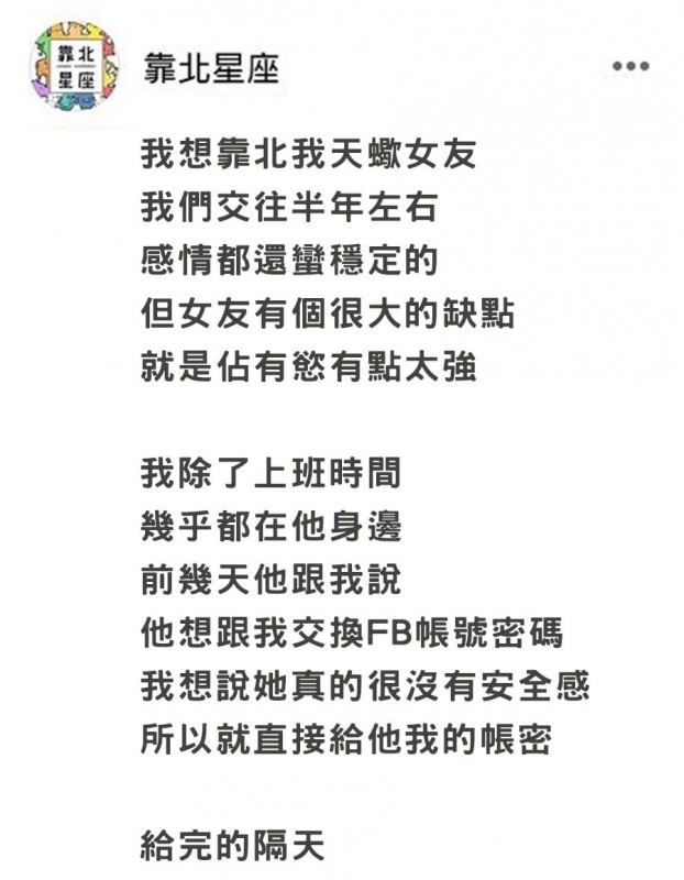 情侶間難免會相互吃醋,一名男網友為了給女友安全感,便將臉書的帳號、密碼都交給對方,豈料,交出帳密的隔