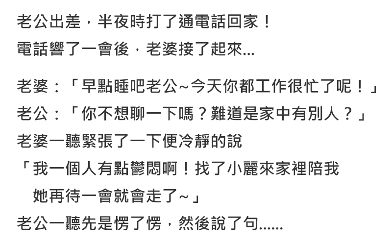 老婆:「早點睡吧老公~今天你都工作很忙了呢!」 老公:「你不想和我聊一下嗎?難道是家中