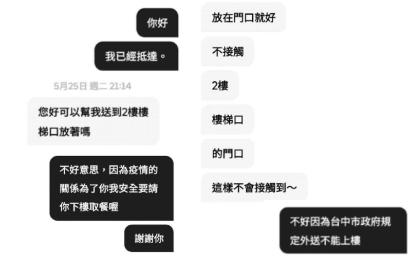 台中市政府為防止疫情擴散,規定外送人員送餐時應全程戴口罩,並遵守交通規則,勿搶快超速、勿闖紅燈、勿違