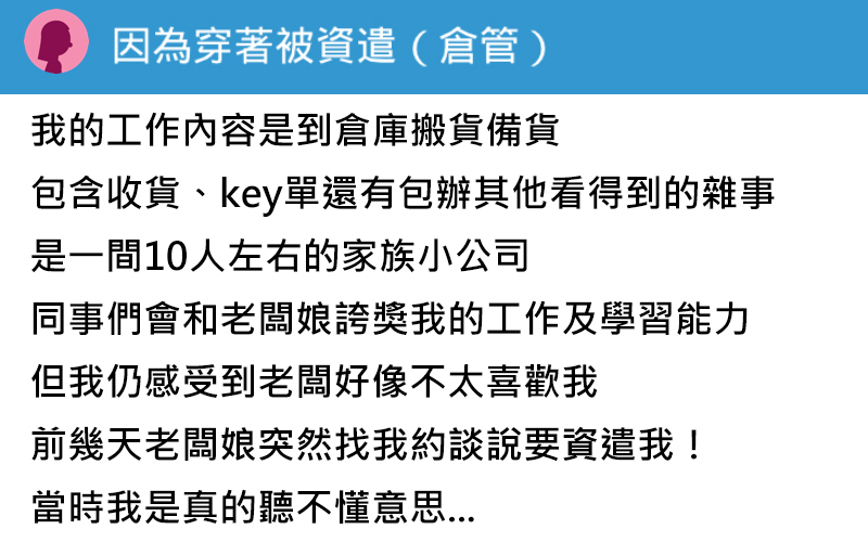 我去年剛畢業 前陣子找到自己能夠承擔的職務 (倉管) 我的工作內容是到倉庫搬貨備貨 還有收貨 key