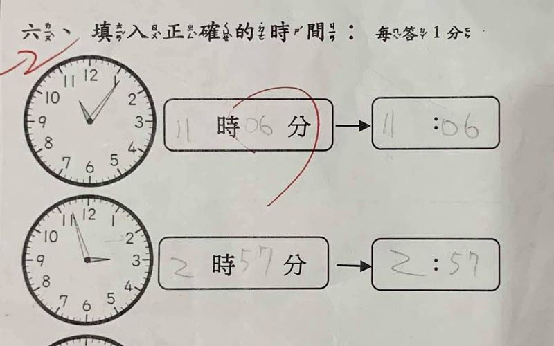 一位家長在幫讀國小二年級的孩子訂正考卷時,發現依時鐘顯示,答案填寫「11時06分」,卻被老師圈起來扣