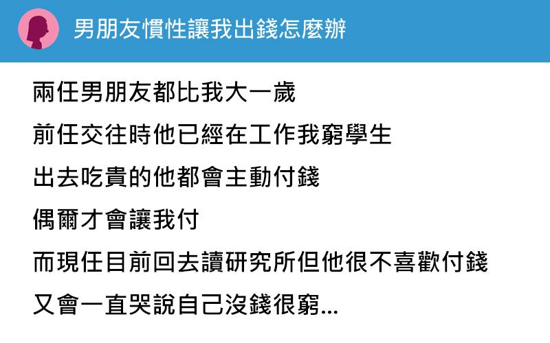 網友po文抱怨:【男朋友慣性讓我出錢怎麼辦??】 先說一下前情提要好了 兩任男朋友都比我大一歲 前任