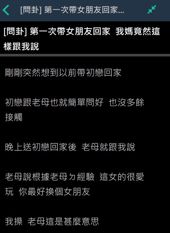 長輩看人的眼光都很準確嗎?一名男網友回想初戀的往事,透露某次帶女友回家,對方看到媽媽也禮貌地打聲招呼