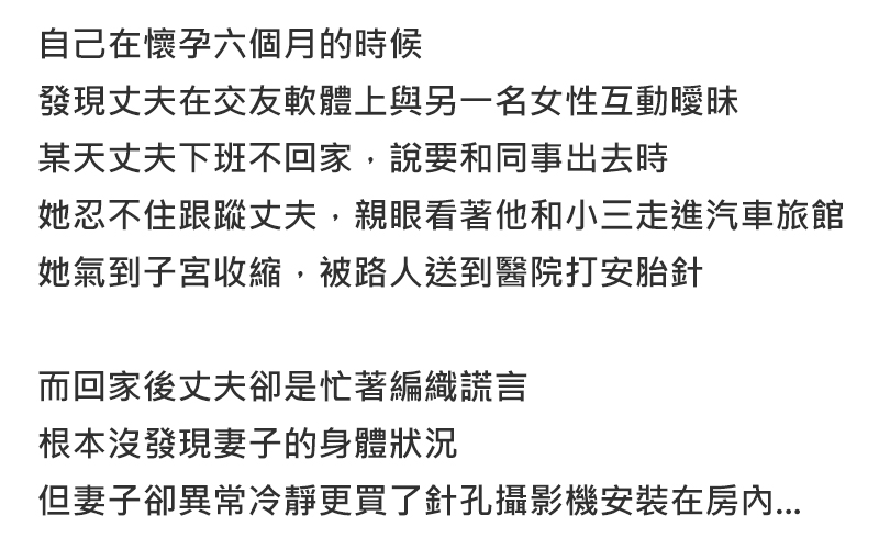 網友在臉書社團上發文抱怨: 自己懷孕時發現丈夫出 軌,就在隱忍多個月後現在的她終於解脫