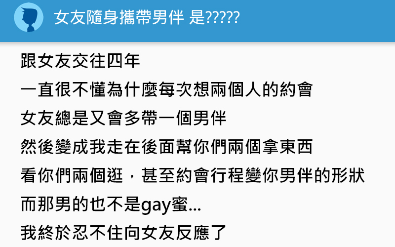 跟女友交往四年 一直很不懂為什麼每次想兩個人的約會 女友總是又會多帶一個男伴 然後變成我走在後面幫你
