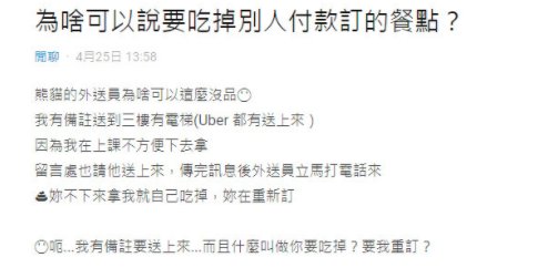 ▲有網友要求外送員將餐點送上樓,沒想到竟因此被嗆。 外送爭議又一樁!有女網友日前訂了外送,並希望外送