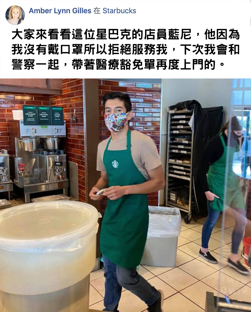 最近因為疫情的關係,服務業也都如驚弓之鳥,生怕一個不小心就會造成群聚傳播。 美國加州的一位星巴克的咖