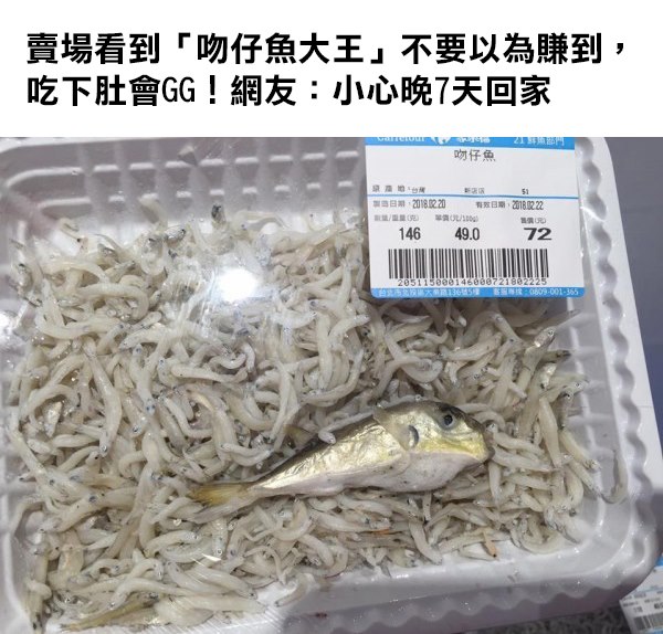 一名女網友在逛知名大賣場時,發現擺放在生鮮櫃裡的一盒吻仔魚裡,竟夾雜了一條「吻仔魚之王