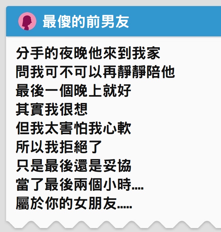 原文如下: 昨天晚上 和前任和平分手了,其實交往以來他一直對我很好,那種 簡簡單單 很