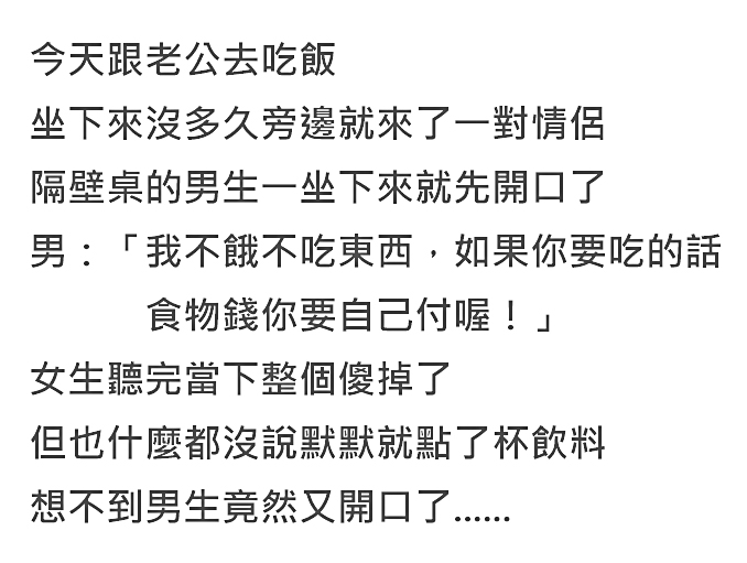 網友在臉書社團上發文 –以下為真實遇到情況 今天跟老公去吃飯,坐下來沒多久旁邊就來了一對