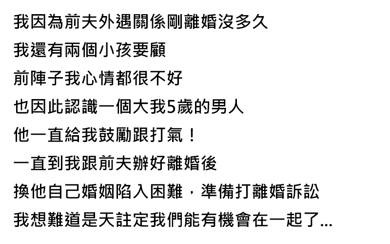 跟先生因為外遇離婚,然後喜歡上還沒辦妥離.婚的男鄰居,急著告白落來了個破壞人家家庭的臭.名會有比較光
