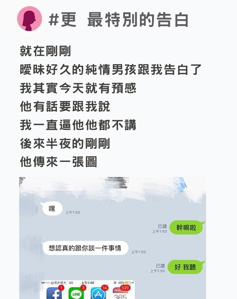 對許多女孩子來說,「告白」是十分令人期待的環節,不過卻讓男生的腦 筋 打 結啊。有女網友日前貼出喜歡