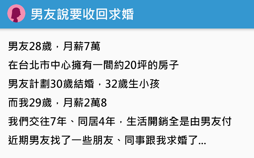一名29歲的女網友表示:交往7年的男友有一天找了一群朋友給她求婚驚喜,當下她雖然感動答應,但事後又覺