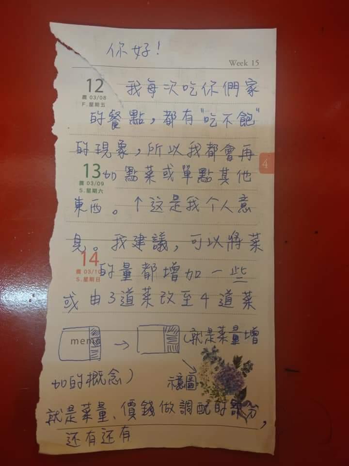 一份便當60元可以提供免費加飯.. 想不到卻收到客人寫的紙條說覺得吃不飽,當面詢問之後才知道,她覺得