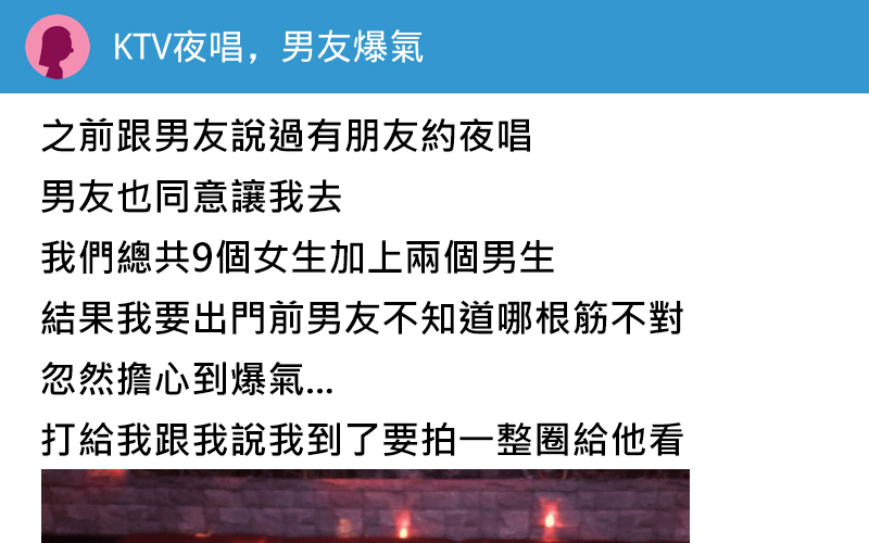 網友在臉書上發文表示不明白自己和朋友去KTV夜唱,男友卻爆氣了… 之前跟男友說過有朋友約