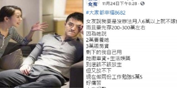 情侶金錢觀不同恐成分手導火線,一名男網友抱怨和女友論及婚嫁,但對方開出許多條件,除了要求他月薪須達6