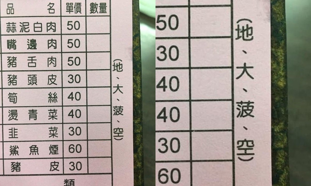 ▲菜單上印台灣人才懂的「地、大、菠、空」。 這是台灣人的默契! 一位女網友在《Dcar