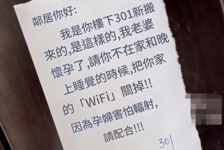 紙條是樓下鄰居貼的,因為他的妻子懷孕了,擔心輻射影響胎兒,便要求鄰居不在家的時候,和晚上睡覺的時候把WiFi關閉,並「請鄰居配合」。