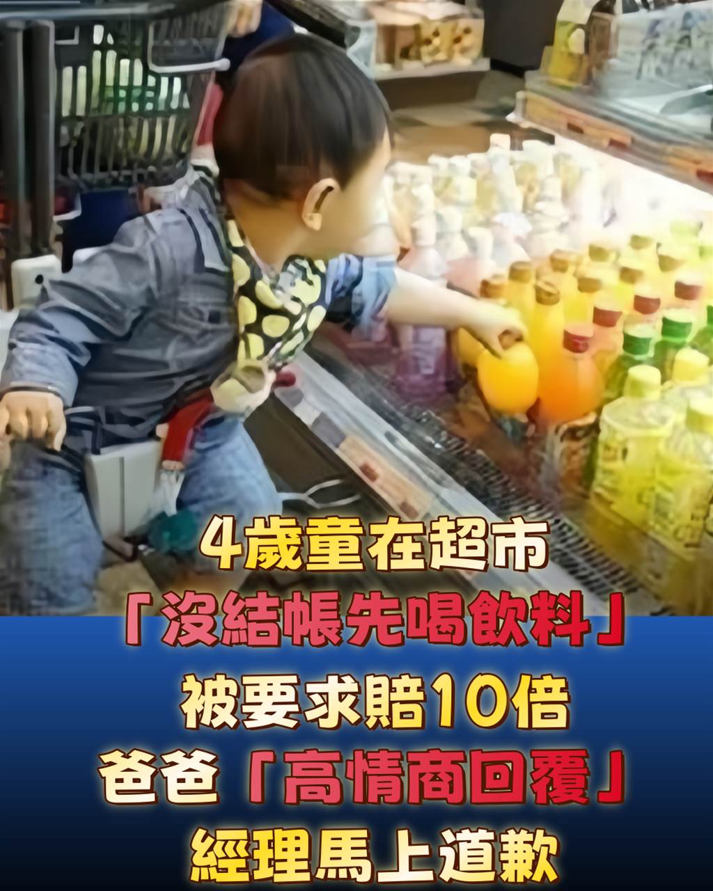 爸爸聽完先是愣住看著店員10幾秒,接著不疾不徐詢問:「我沒有把東西不結賬就帶出超市,而是正常拿著飲料瓶結賬,為什麼要賠10倍價格?如果你堅持要10倍賠償,就把你剛才的話再說一遍,我把你的話錄下來,去問問物價局,看看這個規定是否合理,好不好?」