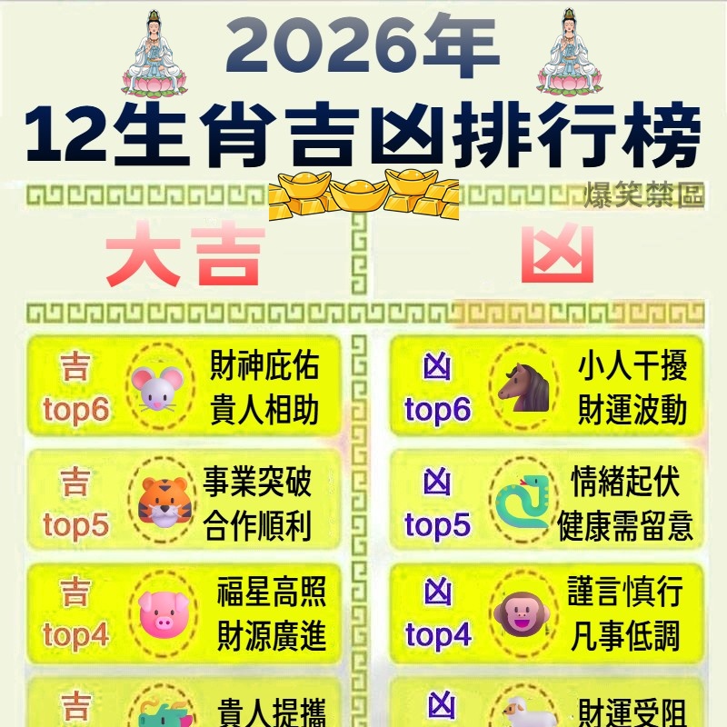 吉 Top 1生肖雞 🐔運勢最旺,事業家庭雙美。 恭喜屬雞的朋友!你們將是2026年運勢最旺的生肖!各方面都順利無比,財源滾滾,擋都擋不住。不僅事業上有極佳的發展,家庭關係也和睦甜蜜,是事業家庭雙美、福氣滿滿的一年!