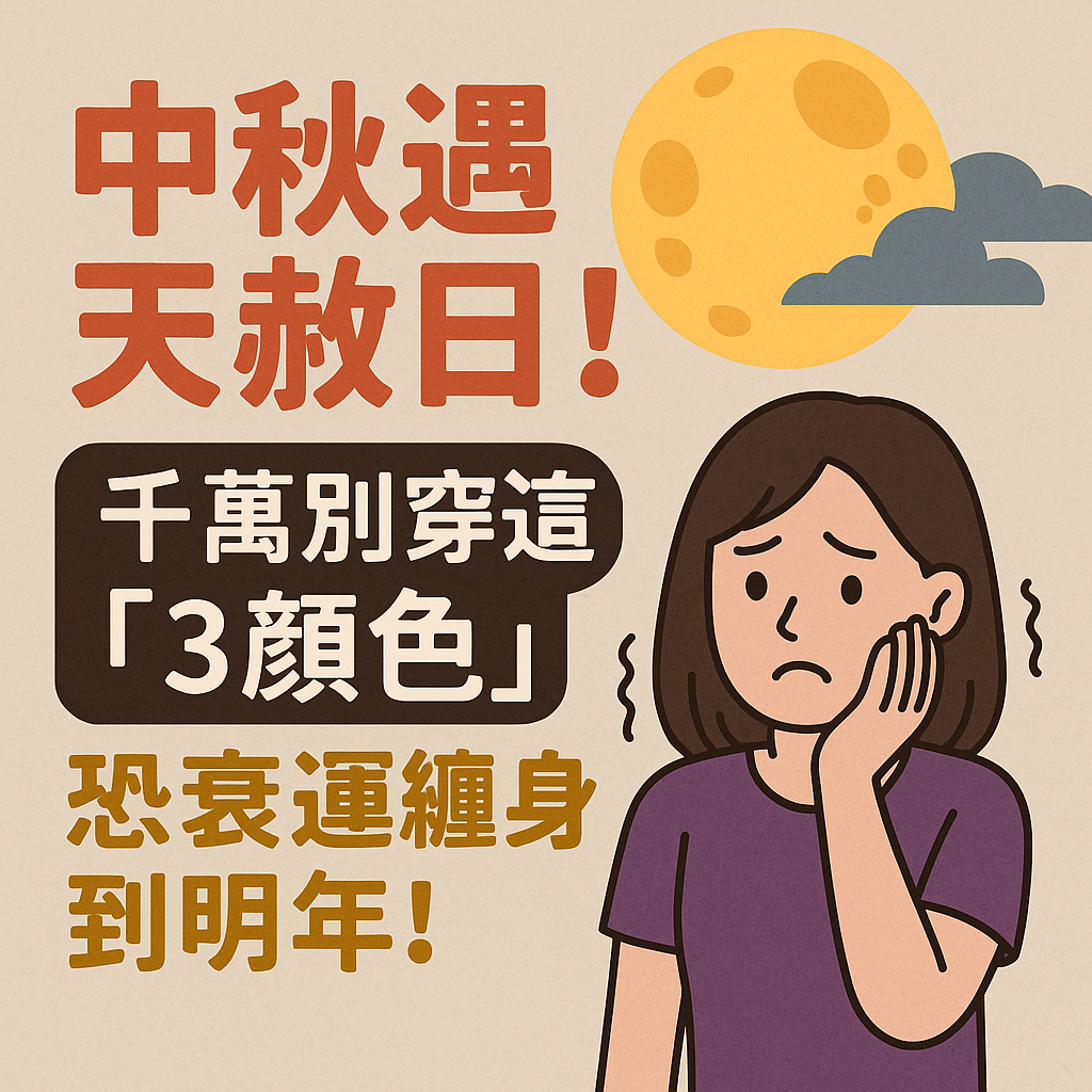 中秋節本是闔家團圓、共享明月的好日子,而今年更罕見地碰上「天赦日」,這一天被稱為「上天赦罪、轉運補運」的極佳時機。但民俗專家提醒,若在這天不慎穿錯顏色,可能會「破運氣、招穢氣」,讓原本的好運全被沖走,甚至一路衰到明年!